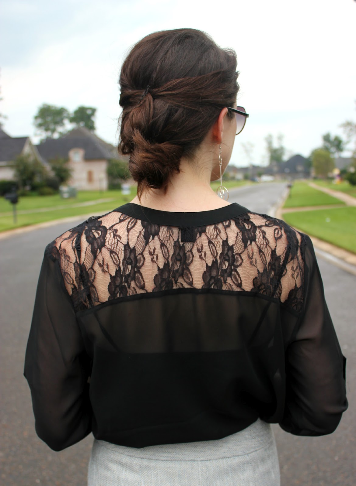 Sometimes you can't go wrong with a simple blouse and pencil skirt. Adding a lace insert to the back of a blouse like this one keeps it from getting too boring.